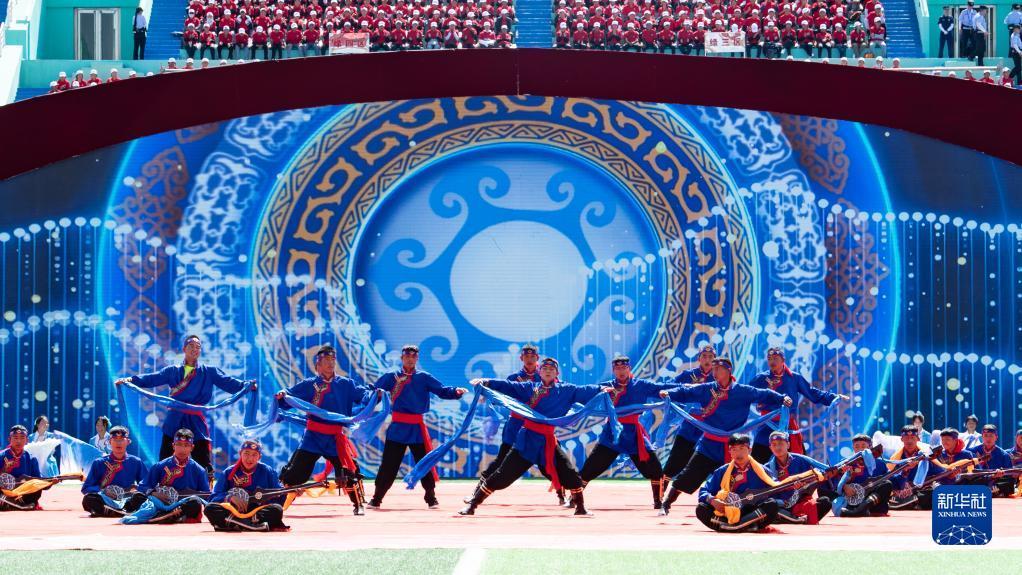 8月1日,当地群众在海南藏族自治州成立70周年庆祝大会上表演。