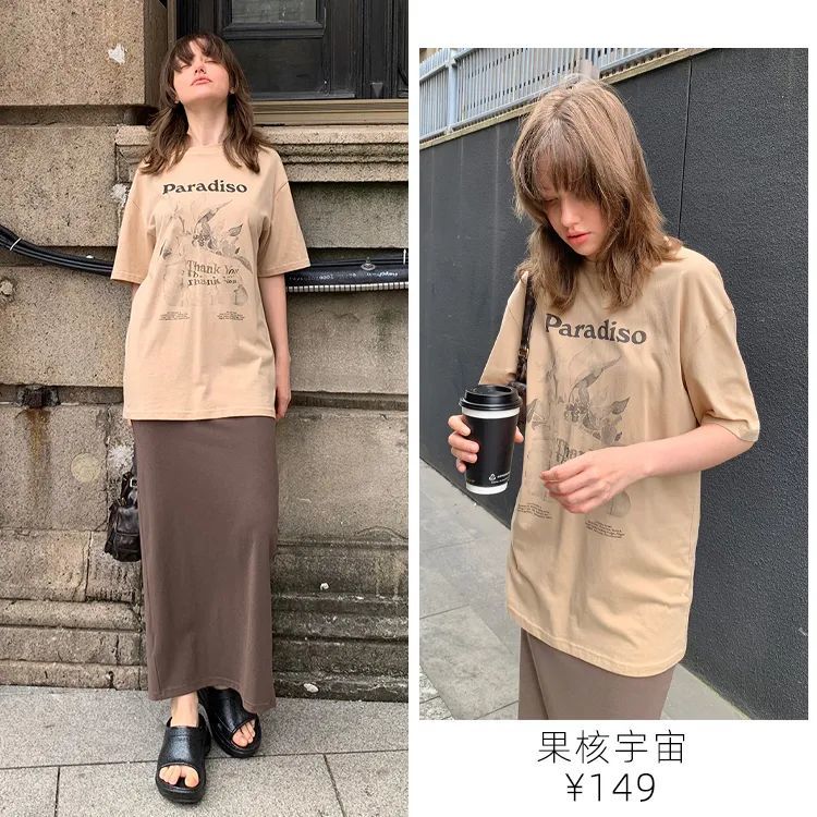 喜欢复古风的可以看看果核宇宙这件,驼色系配上复古印花,可以一直穿到秋天。
