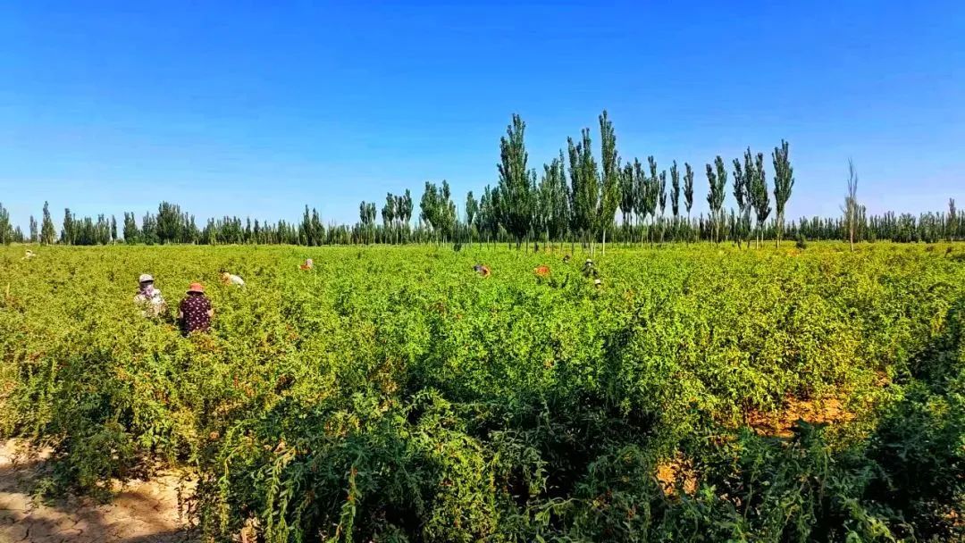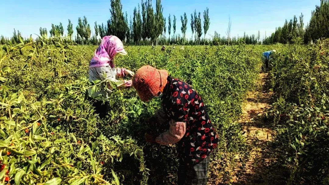 在瓜州县双塔镇古城村吴自全家的枸杞地里,包着头巾的女工或站着或坐着,两只手穿梭在结满果实的枝头间,一采一放,动作娴熟。桶里盛满了红彤彤、色泽透亮的鲜果,这些枸杞经过称重后将统一运送到加工厂。