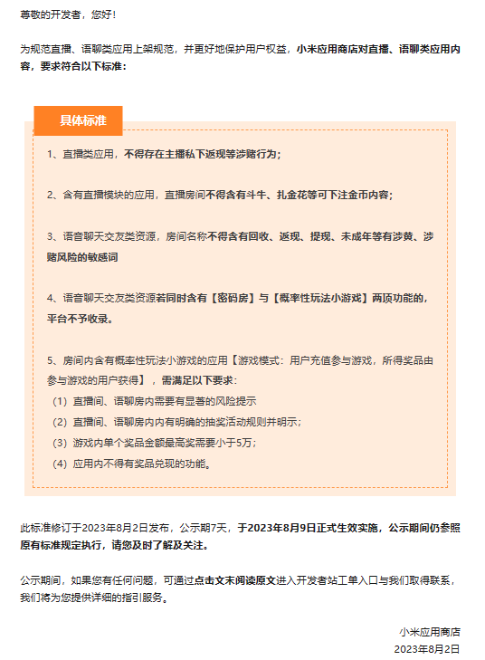 鞭牛士 8月2日消息,今日,小米应用商店发布公告称,为规范直播、语聊类应用上架规范,并更好地保护用户权益,小米应用商店对直播、语聊类应用内容,要求符合以下标准:直播类应用,不得存在主播私下返现等涉赌行为;含有直播模块的应用,直播房间不得含有斗牛、扎金花等可下注金币内容;语音聊天交友类资源,房间名称不得含有回收、返现、提现、未成年等有涉黄、涉赌风险的敏感词;语音聊天交友类资源若同时含有【密码房】与【概率性玩法小游戏】两项功能的,平台不予收录。
