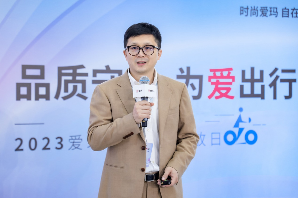 图:爱玛科技集团代理总裁罗庆一做开场致辞,对媒体的到来表示欢迎