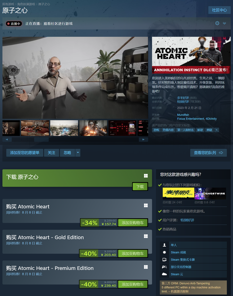 如果心仪这款游戏,可以到Steam平台购买。目前Steam上促销力度较大,标准版66折,黄金版6折,白金版6折。