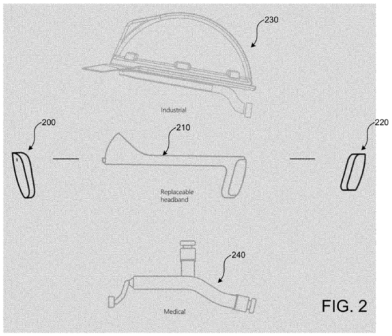 该专利的标题为模块化头戴设备。通过图片和摘要,我们可以大致了解该设备的特性,它分为前后两个模块和框架。前面的模块应该是主要的,它包含传感器和显示部分,还有相应的处理和存储子系统。显示部分由光波导部件、投影设备等组成。前面的模块拥有一个标准的接口,该接口可连接不同的框架,从而变为不同的形态,在专利图中,微软就展示了将其连接到头盔或一般VR头带,甚至普通眼镜架上的样子。后模块是附加在后脑勺位置的,可以提供电源和更多的传感器,还有计算能力。