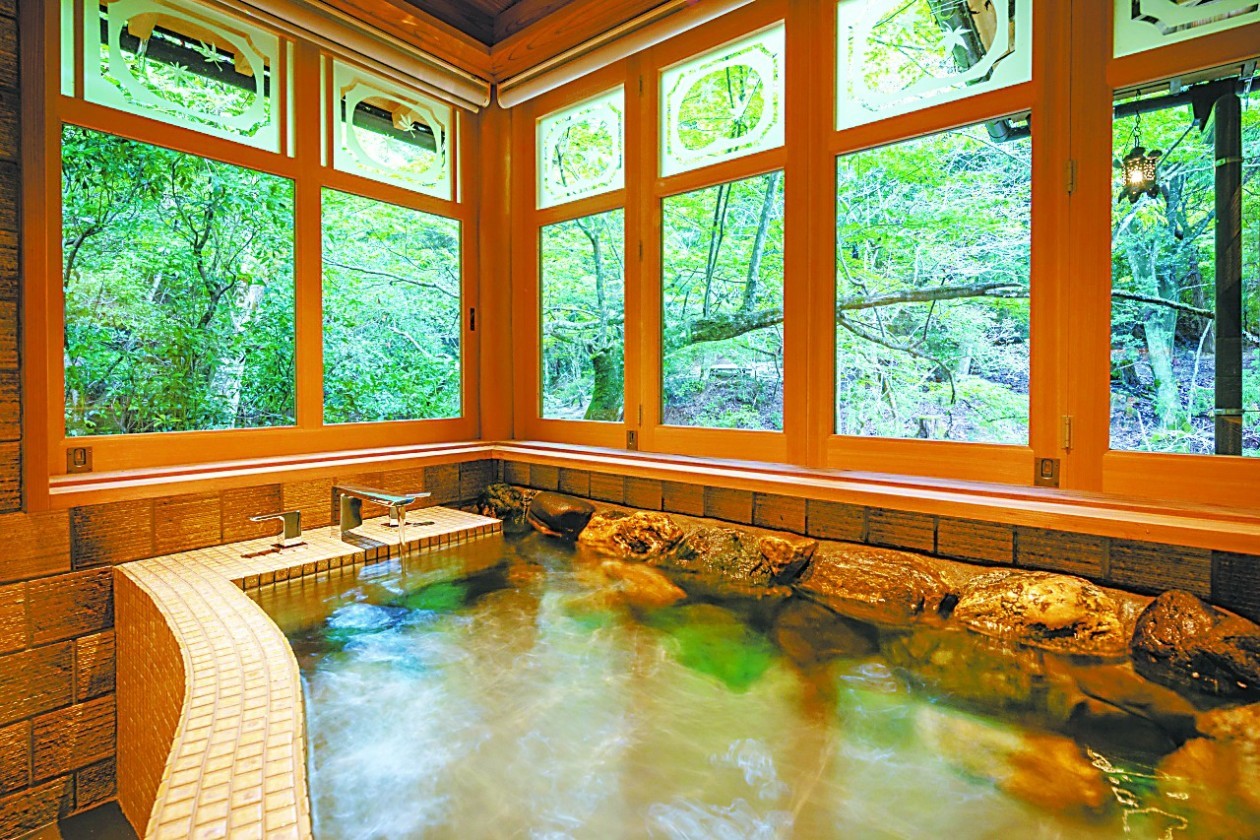 许是与古代旅馆的选址有关,温泉是大多数日式旅馆的必备设施。不同旅馆的温泉各有各的侧重,从种类上分,有硫磺泉、酸性泉等,其功效也不尽相同。从引入温泉的方式上看,有的是“源泉挂流”,即温泉水直接流入浴池,然后直接排出;也有的旅馆通过管道引泉进房,打造私汤。从泡温泉的形式分,有室内温泉和露天温泉,露天温泉又根据可观赏到的景色分门别类。