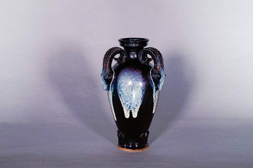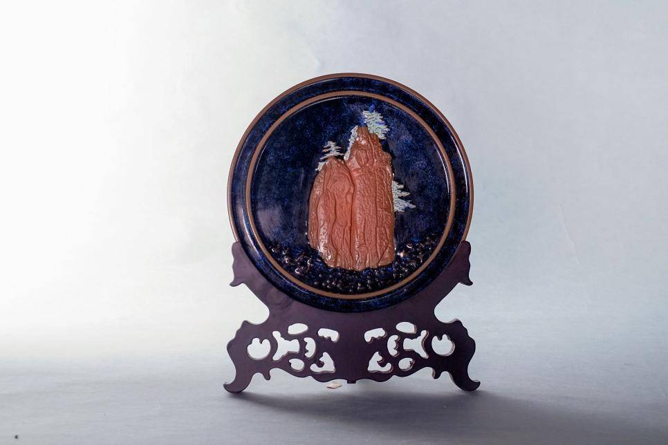 《金山水韵》也是有故事的。为了技艺更上层楼,2019年、2020年、2022年,袁留福连续三年参加人社部在景德镇陶瓷学院举办的中国非物质文化高研培训班。繁忙的课业之余,他多次向讲学的教授求教,恨不能把他们的才思和学问全都吸收过来!有一次,教授跟他说:老祖宗传下来的技艺要结合釉色创新,才能有新品脱颖而出。花瓷釉色有肌理感,适宜山水造型。袁留福心中灵光一闪,开始悉心琢磨,有一次喝多了,大尧山的形貌在脑海里赫然浮现!山的肌理,水的韵致,正是展现花瓷釉色的大好素材!回来后立即动手试烧,最终烧出了“金山水韵” 这一大气磅礴的精品。2021年在浙江举行的全国非遗创新大赛上,荣获优秀创意奖,浙江博物馆的专家越看越喜欢,托人请客,软磨硬泡,最终3.6万元买去当了馆藏之宝。