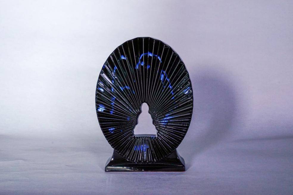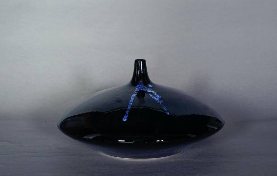 这仿若天成的《水滴》,真的是匠人用双手拉泥成胚烧造出来的吗?袁留福说:“这是用高白泥做胎、纯黑釉,打破了传统造型,曾经在山西全国设计大赛上获得金奖。”老子说:“上善若水,水利万物而不争”,不用语言解读,入眼入心时,这颗纯净《水滴》的锐光就会把人穿透。一走神,我不由联想到小说《三体》里的水滴,一滴看似弱小的物质,竟然具有洞透星体、毁天灭地的力量。再看眼前的花瓷《水滴》,这人手天成的造物,情不自禁,心生震撼!扁圆的造型,极具个性,仿佛活了一般。