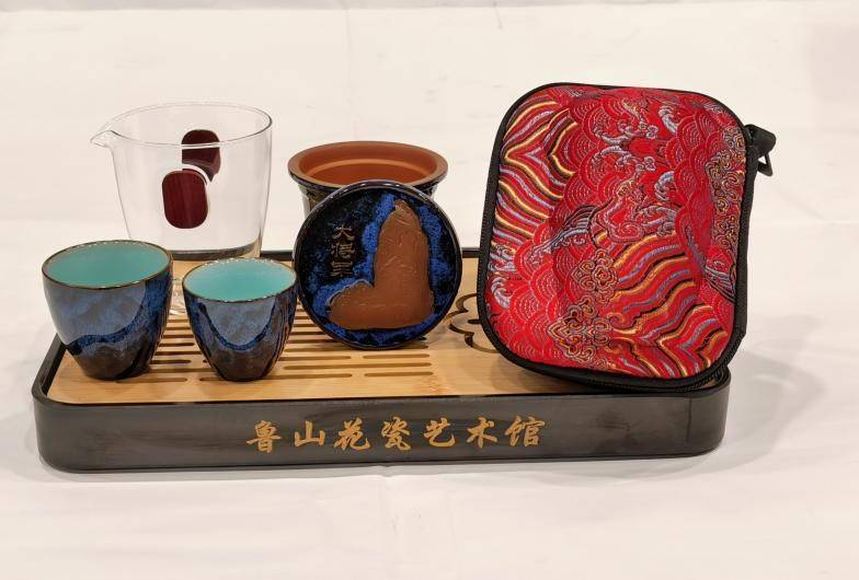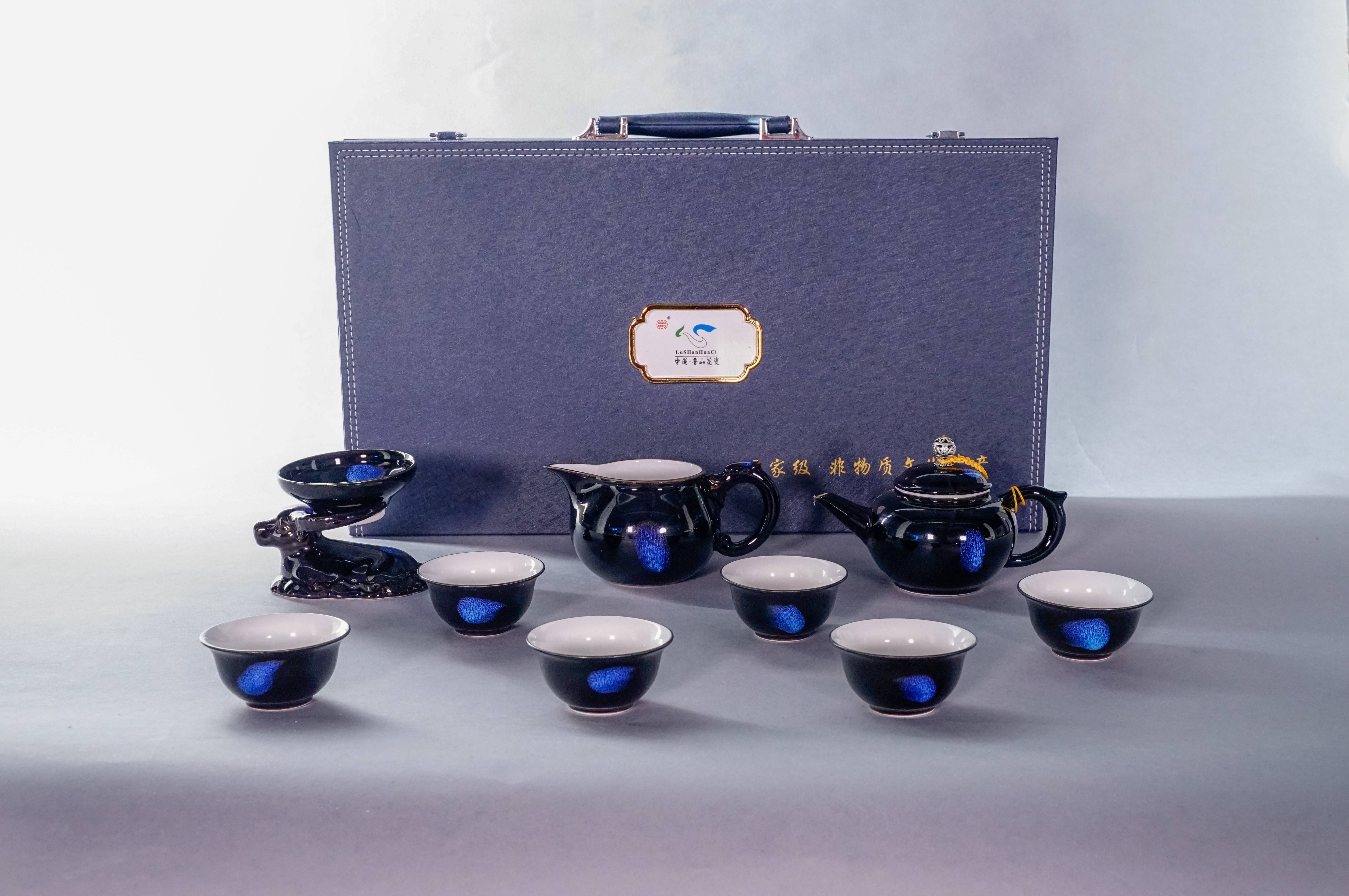 我在那套《鲁山花瓷如意茶具》前站了很久,想起《红楼梦》中的诗句:“解语何妨话片时”。黑底点缀着白釉,融手可温,温厚若美玉。内里翡翠绿釉和白釉交融,微微泛出生命的一缕灵妙,如同美少女流丽婉转的眸光,温润迷人。袁留福说,试验烧出这套茶具,用了一年多时间,才把两种釉调到一个合适的温度,还要保证外面的釉不跑到里面去,难度比较大,也因之获得了发明专利。这套茶具泡出来的茶汤,清莹澄澈,视觉效果极好。