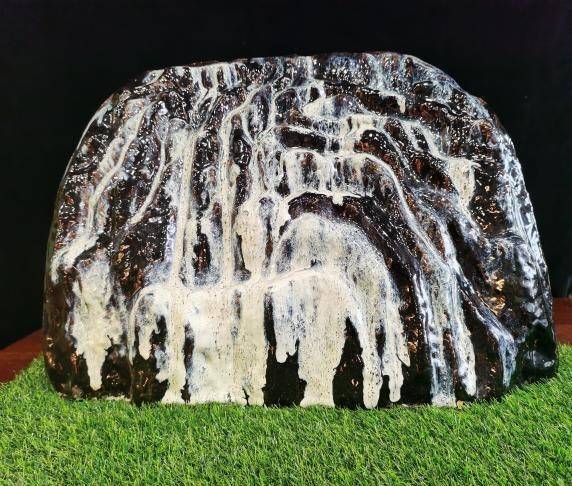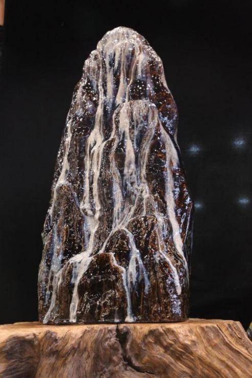 《灵妙宝山》,竖看,仿若白发仙人背对红尘,横看,又像是仙人拨动的琴弦,水气息,山精神,一时都到眼前来!人们不知道的是,花瓷胎坯与成品的收缩比是15%~18%,这座《灵妙宝山》高90厘米,大小错一寸就不能成功。还有,铝的比例小了,会裂;烧流、烧歪了,得添加适量的钾长石……