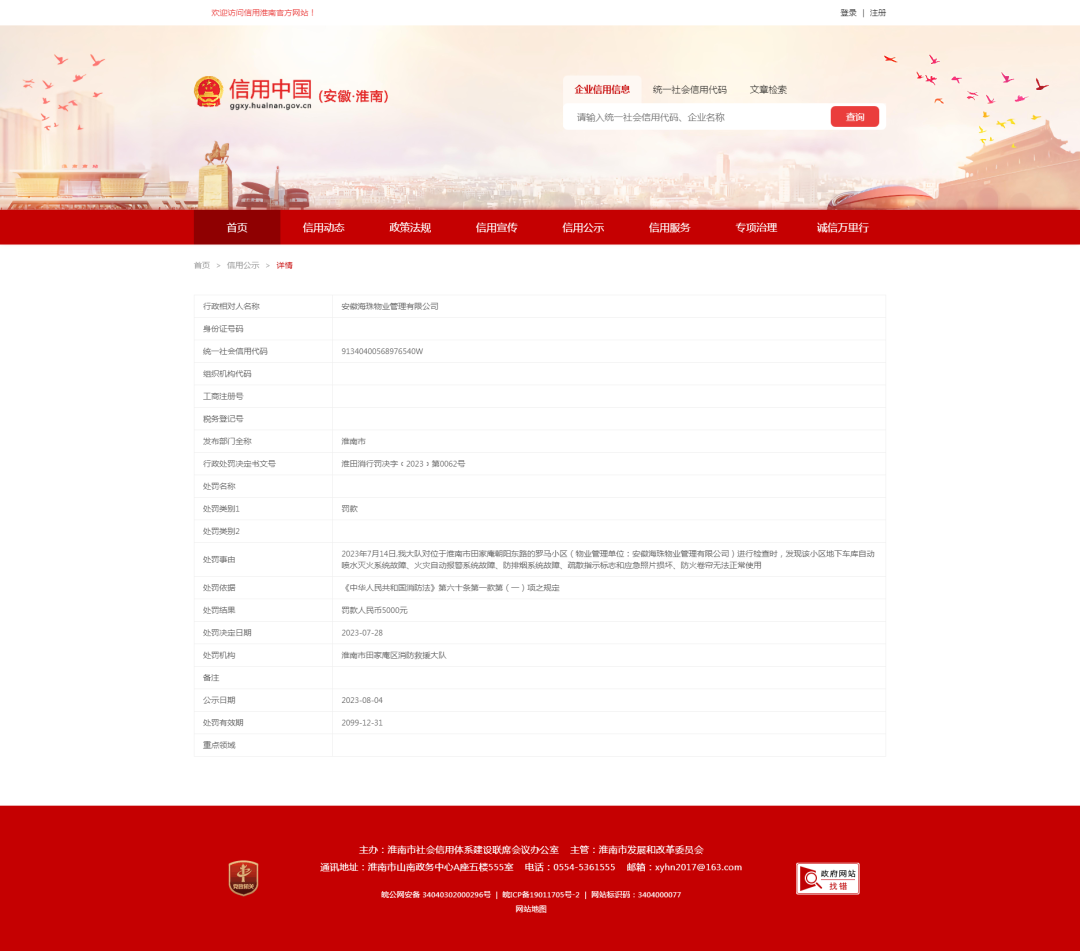 近日,信用淮南行政处罚显示:安徽两家物业公司被罚!