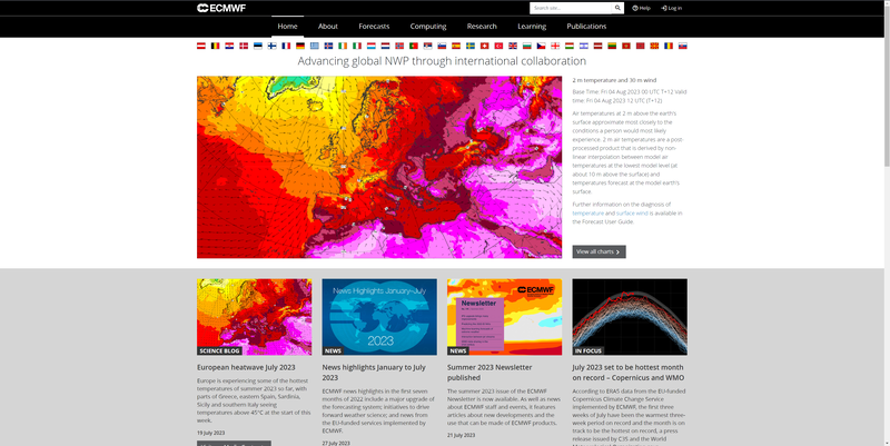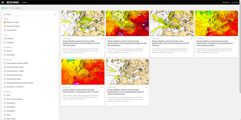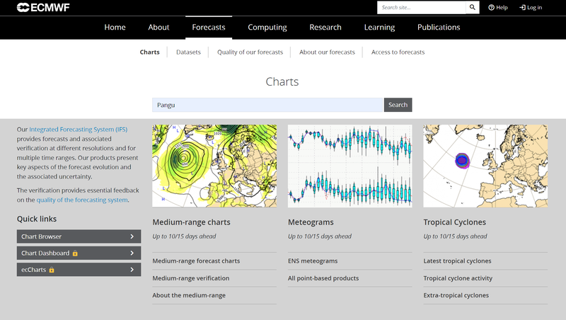 首先,我们进入ECMWF的官网(https://www.ecmwf.int/),然后点击Forecasts(预测),在目录中选择Charts,就可以看到一个搜索框,接着我们输入Pangu(盘古)进行搜索就可以检索到盘古气象模型的Ai预测结果图表。