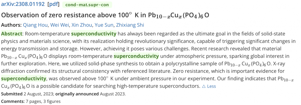 目前,东南大学物理学院超导研究团队的相关论文已经在arXiv上发表(如下图所示),论文摘要中也写道,零电阻是超导电性的重要证据,实验表明Pb₁₀-ₓCuₓ(PO₄)₆O 可能是高温超导体的候选者。