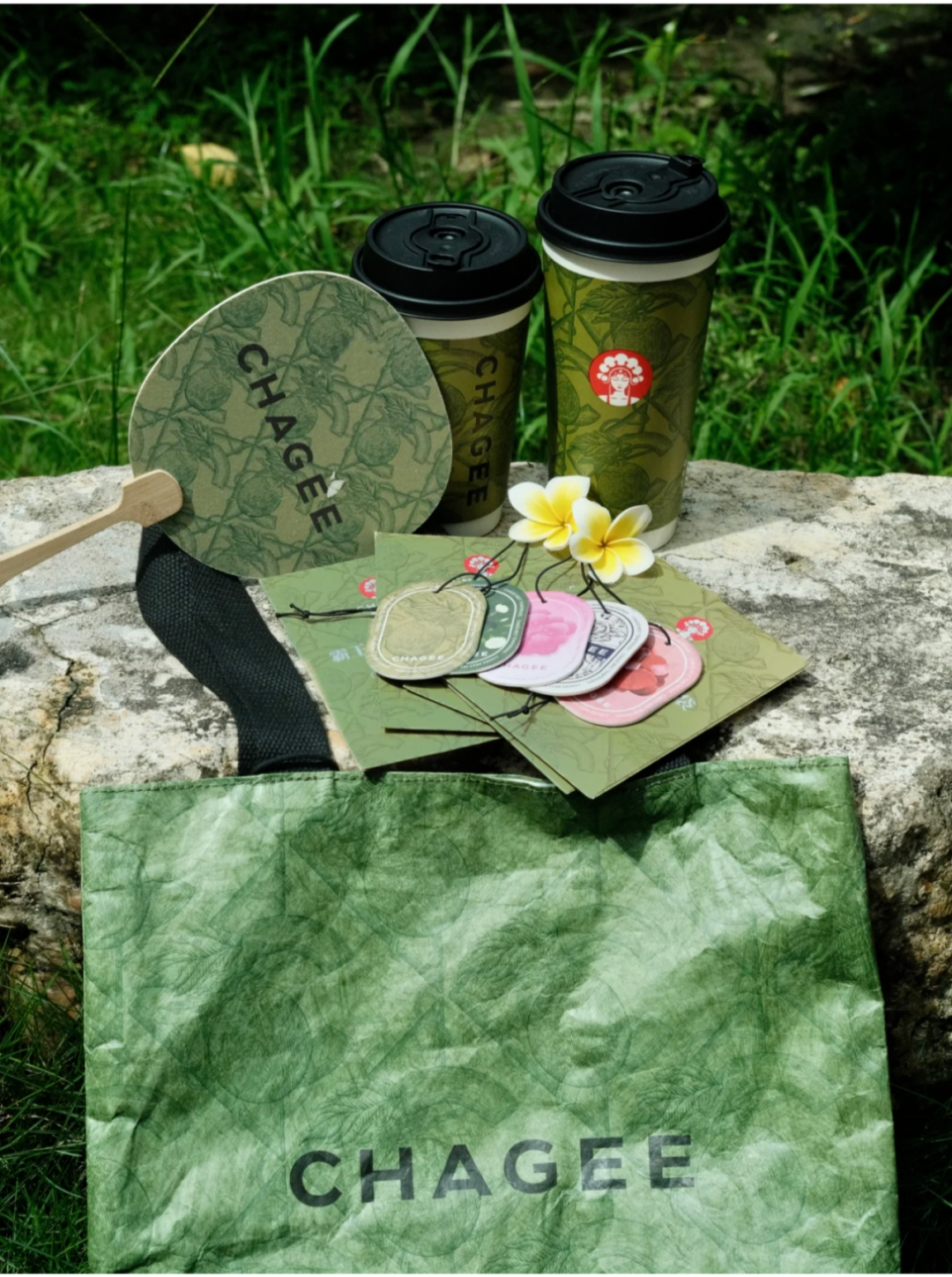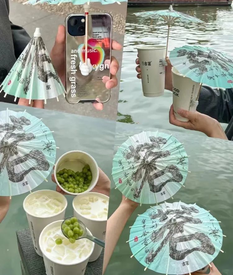 古茗在新品「龙井香青团」和「龙井香牛乳茶」推出的时候,还推出了古茗专属油纸伞,一整个国风。