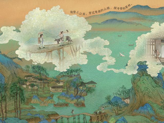 在这本绘本中,作者把希孟置入到山水之中,我们看到了一个少年,背着行囊走在林间水榭,山前小路中有他忙碌的身影。