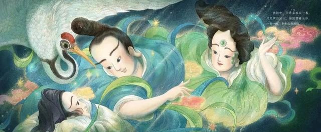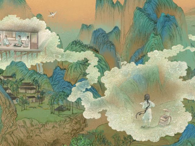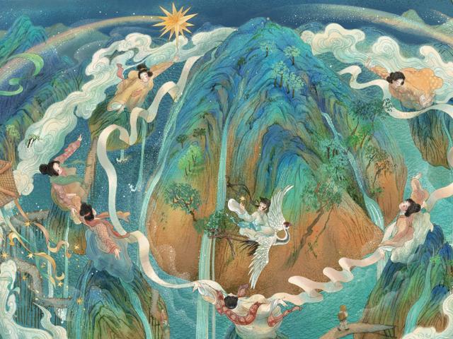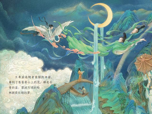 仙鹤驮起王希孟,青绿指引他前往仙境,终于体会到了在山水之间的快乐。
