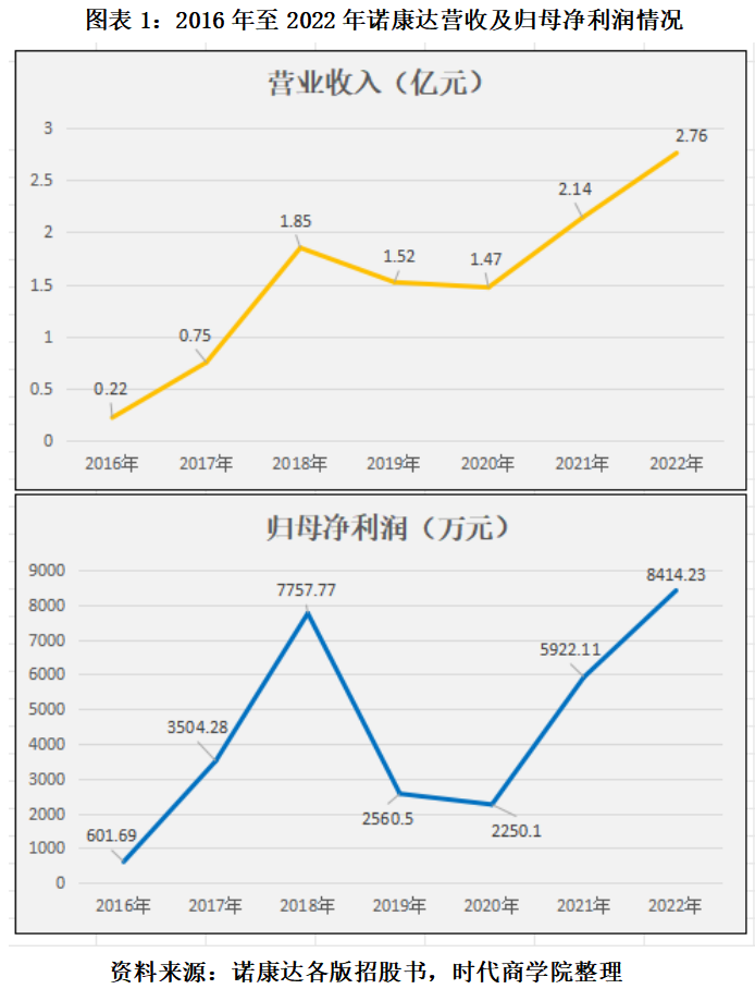 根据本次创业板申报材料,2019—2022年,诺康达的营业收入分别为1.52亿元、1.47亿元、2.14亿元、2.76亿元;归母净利润分别为2560.50万元、2250.10万元、5922.11万元、8414.23万元。
