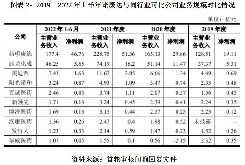 诺康达在招股书中表示,其总体业务规模远小于以药明康德(603259.SH)、康龙化成(300759.SZ)为代表的少数全面综合型CRO公司,与阳光诺和(688621.SH)、百诚医药(301096.SZ)和美迪西(688202.SH)等相比仍然较小,与天津市汉康医药生物技术有限公司、南京华威医药科技集团有限公司等相当,在行业竞争日益加剧的背景下,公司抵御市场风险能力有限。