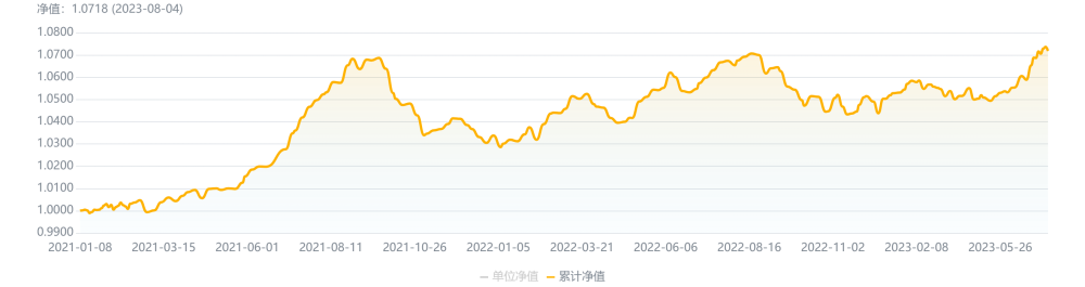 从累计净值走势来看,产品自成立以来累计净值便一路上涨,于21年9月达到高位随后步入震荡区间,今年以来产品累计净值呈上升趋势,截至8月4日,累计净值收至1.0718。