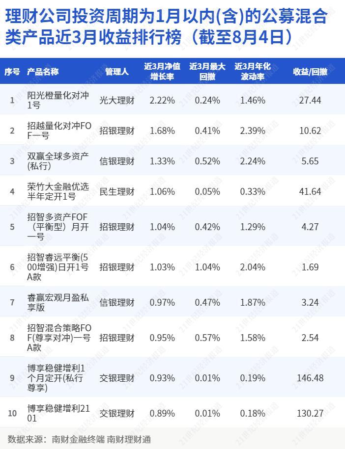 南财理财通数据显示,截至8月4日,理财公司投资周期为1月以内(含)的公募混合类产品近3月收益排行榜出炉,共有5家理财公司产品上榜。其中,招银理财有4只产品上榜,信银理财和交银理财各有2只产品上榜,光大理财和民生理财各有1只产品上榜。