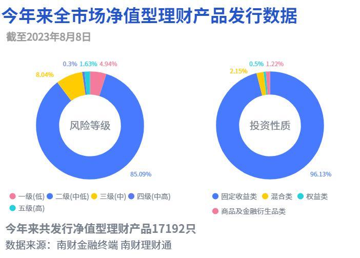 据南财理财通最新数据,截至2023年8月8日,今年来全市场已发行净值型银行理财产品17,192只(含私募产品)。
