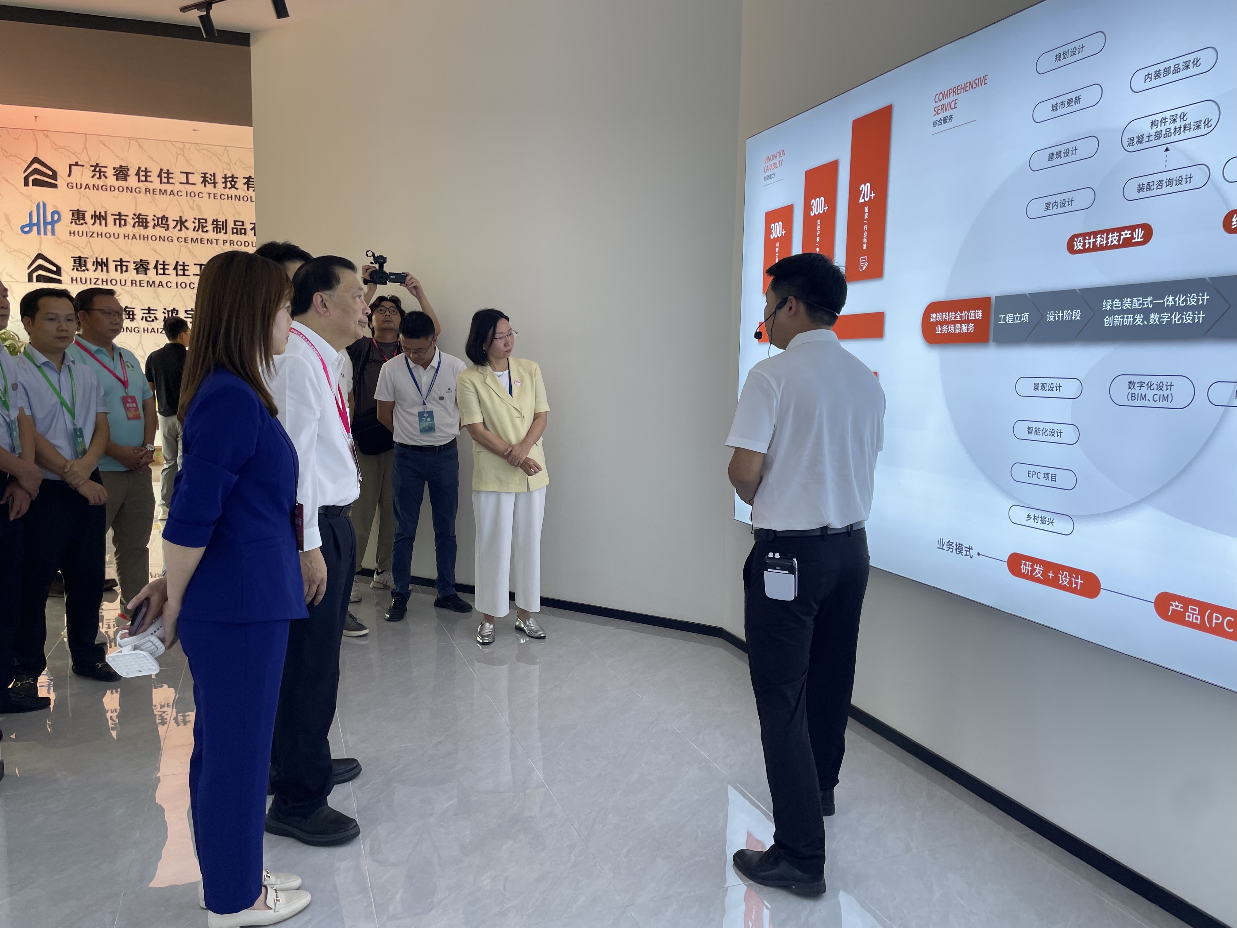 揭牌仪式后,参会领导及近百名香港企业代表共同前往惠州工厂,现场调研了将应用于香港民生房建项目中的预制构件和MiC产品生产的情况。值得一提的是,睿住建筑科技装配式主体结构和内装一体化的整体解决方案,获得参观人员的认可,高度集成化的建筑工业化服务,减少近90%现场施工作业,绿色材料应用在内部装修,为市民提供健康室内空间,契合绿色节能安全建筑理念。