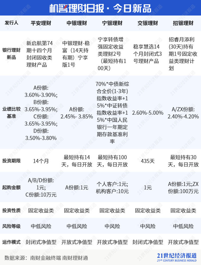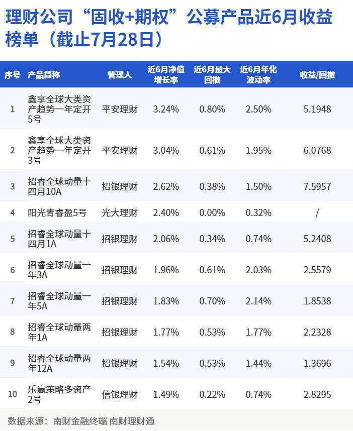 根据南财理财通数据,截至2023年7月28日,在理财公司“固收+期权”公募产品近6月业绩排行榜中,共有4家理财公司上榜,上榜产品分别来自平安理财“鑫享全球大类资产趋势”系列、招银理财“招睿全球动量”系列、光大理财“阳光青睿盈”系列和信银理财“乐赢策略多资产”系列。