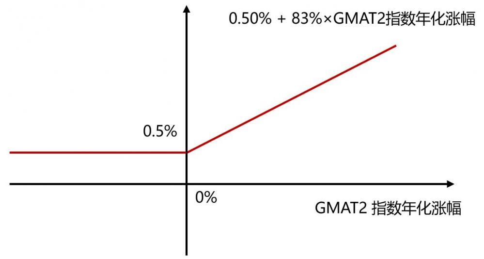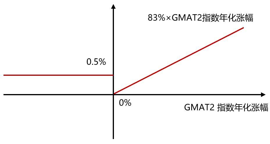 根据该产品今年2月份发布的关联投资标的要素披露公告,在第二个投资周期,该产品调整了关联GMAT2指数表现资产的关联规则,当GMAT2指数年化涨幅<0%时,指数关联资产的年化收益率(年化)不变,仍为0.5%,而当GMAT2指数年化涨幅≥0%时,指数关联资产的年化收益率下调为“83%×GMAT2指数年化涨幅”,即该产品第二个投资周期关联GMAT2指数表现资产的年化收益结构如下图所示。