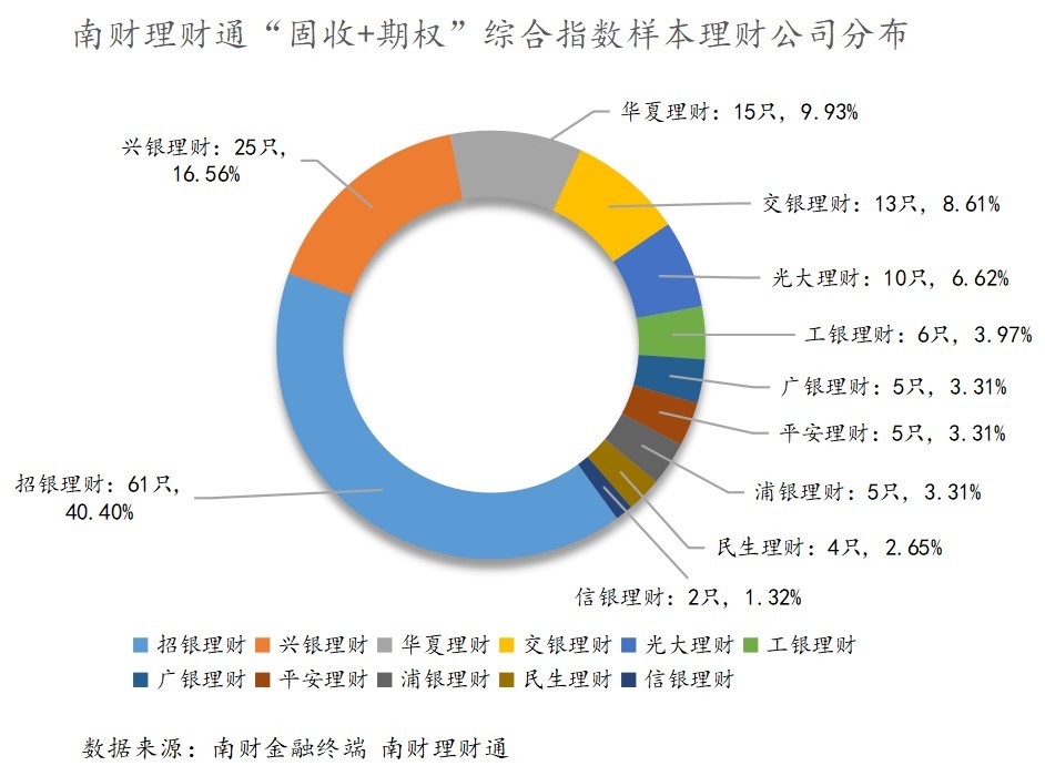 截至7月30日,南财理财通“固收+期权”综合指数值为108.9876,近3月指数增长率为0.5566%,环比上涨0.1071%。本期指数样本为151只,相较上期增加了19只,其中,样本挂钩标的92.74%为指数,4.44%为大宗商品。从理财公司分布看,招银理财产品数量最多,达61只,兴银理财其次,有25只。
