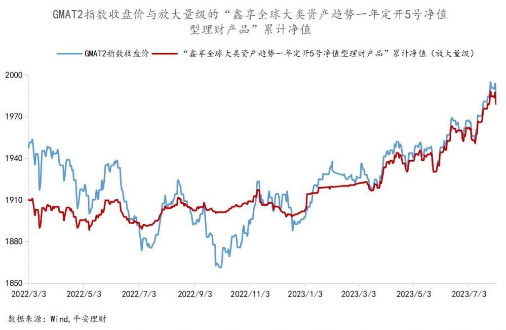 为了直观感受“鑫享全球大类资产趋势一年定开5号”净值与GMAT2指数收盘价的相关性变化,理财通课题组将该产品的累计净值放大至与GMAT2指数收盘价相同量级。由下图可以看出,在第一个投资周期(2022年3月2日-2023年3月7日),“鑫享全球大类资产趋势一年定开5号”的累计净值与GMAT2指数收盘价的相关性相对并不显著,而在第二个投资周期之后,二者的运行轨迹几乎完全一致。