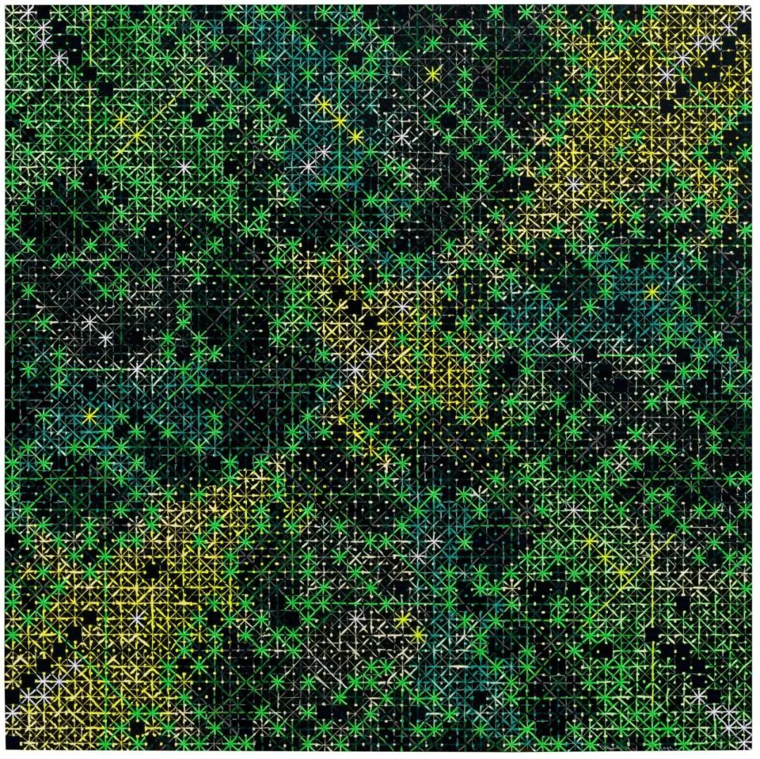 丁乙从印刷业重复和机械的生产方式中汲取灵感,突破了艺术作为表达社会重要思想手段的习惯思维。他将印刷过程中运用的尺和格运用到绘画中,建构了一种更加简洁纯粹的视觉表达方式,让绘画回归到形式的本质。十字和x字是抽象的符号,不指向任何特定的含义或对象,因此,观众将沉浸在纯粹的视觉体验中。