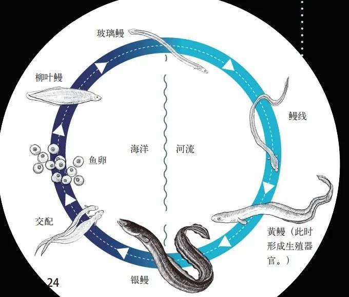 原来,鳗鱼在淡水中生活,但会游到海里某个特定的地方繁殖,并产下鱼卵。当柳叶鳗孵化出来后就会随洋流游往河口,当它们接近河口时,身体成长到下一个阶段——玻璃鳗。玻璃鳗逆流而上,寻找成年鳗的栖息水域,在这期间,玻璃鳗颜色逐渐加深,长成鳗线。
