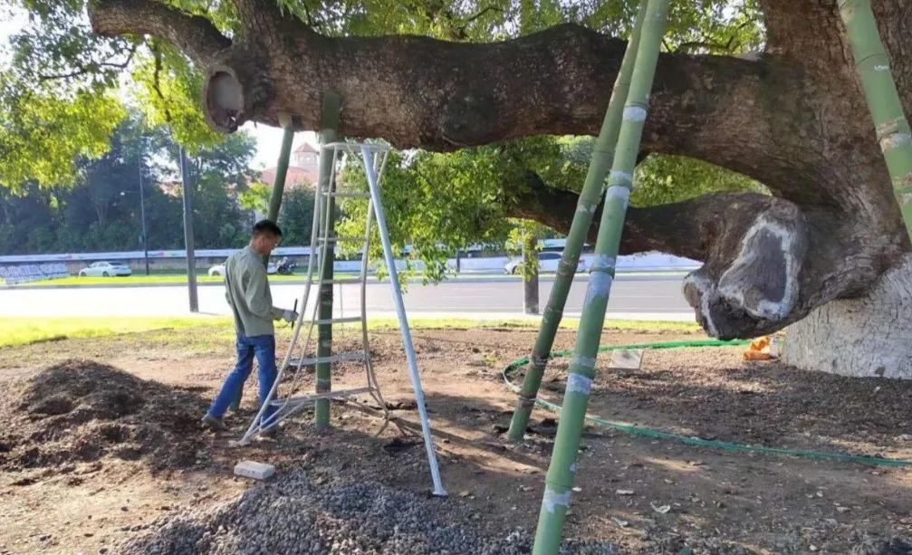 近期,这两棵古香樟又迎来新一轮的保护复壮,进行了局部整修、加固支撑、平整场地、扩大立地保护范围,让它们以生机勃勃的姿态健康生长。