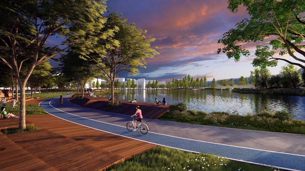 该区块是靠近未来水街入口与周边未来商业地块的滨水区域,将打造沿湖岸而建的木质蜿蜒走廊,连接健身步道,给市民提供一个观赏自然与城市景观的休憩场所。