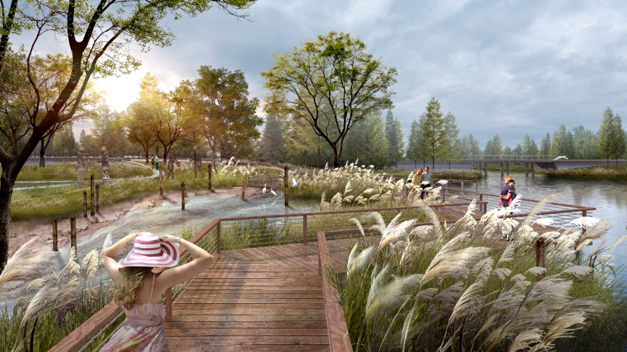 该区块承接北部通惠湖,将构建生态滨水系统,打造湿地科普教育基地,以科普中心及雨水花园的形式,建造丰富多彩的四季景观,并以观赏性植物布置为主,营造特色水上森林、成片芦苇地等纯林形式的植物组团,体现场地的生态性。