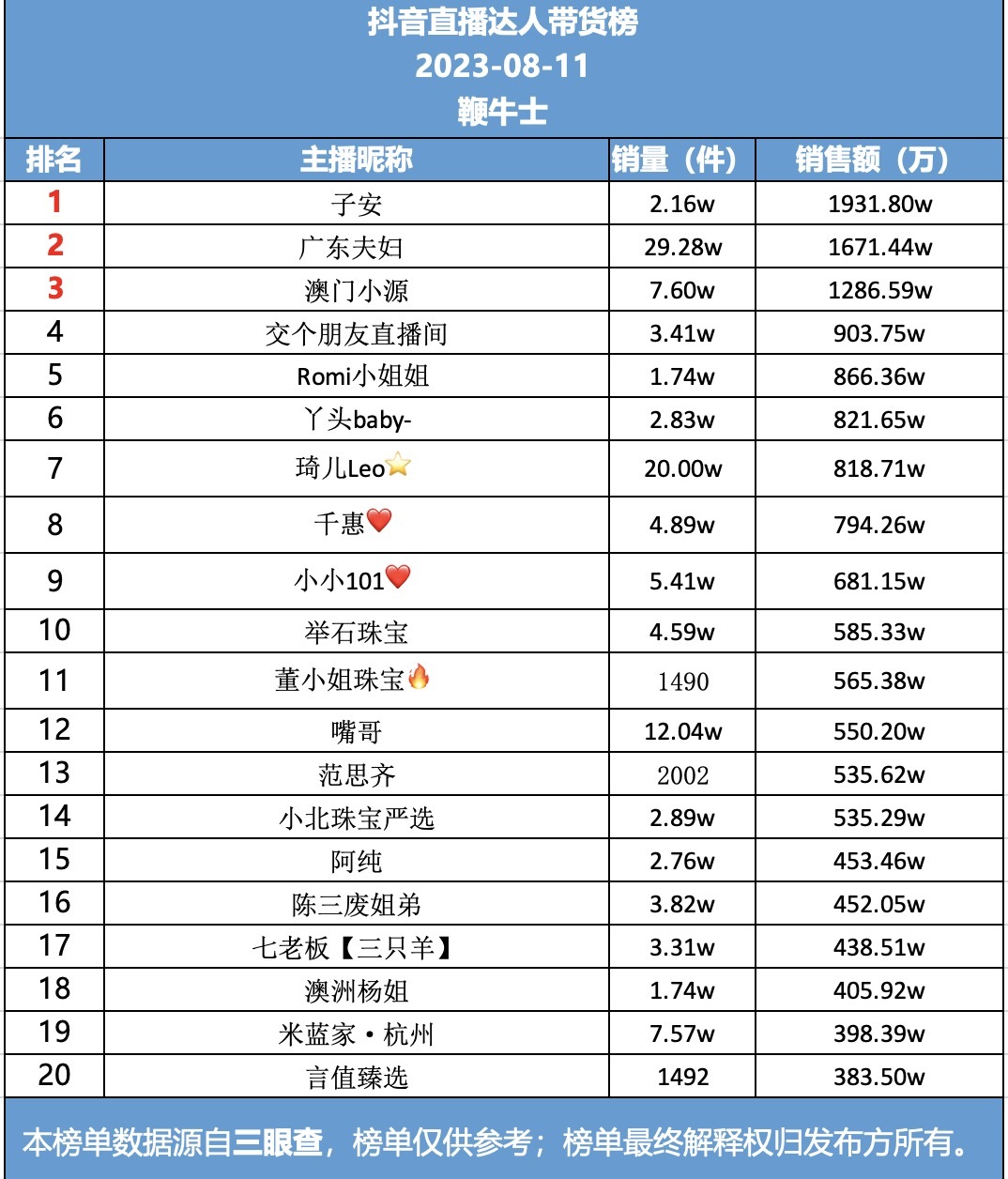 8月11日,抖音直播达人带货榜一是子安,销售额1931.80万;榜二广东夫妇,销售额1671.44万;榜三澳门小源,销售额1286.59万。