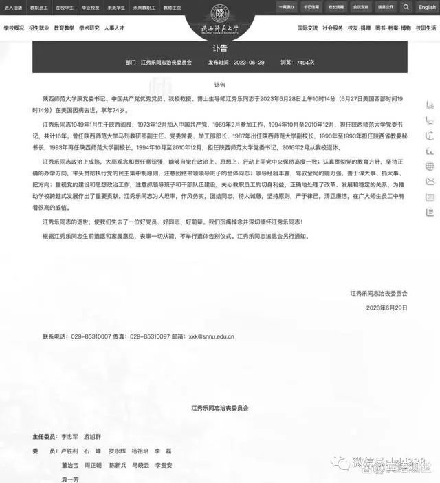 6月29日,“江秀乐同志治丧委员会”在陕西师范大学官网首页发布讣告: