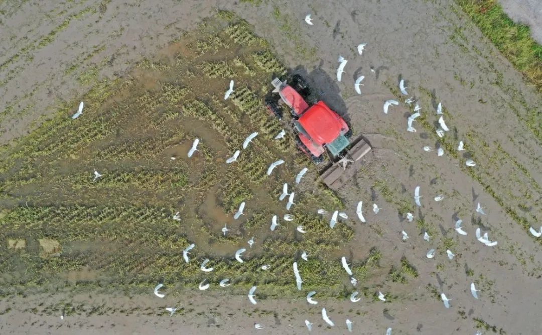 海宁市丁桥镇,成群白鹭在田间觅食飞舞 图源:视觉中国