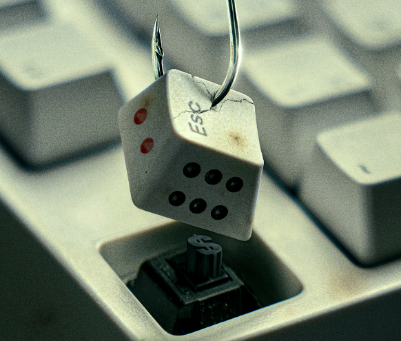 在《孤注一掷》海报上面,鱼钩钓着Esc键盘的一角,侧面印着骰子上的两点和六点,键帽下的黑色键是美元符号$,键盘旁隐隐散落着几滴斑驳的血渍,说明网络赌博只是幌子,背后是电信诈骗和非人虐待。