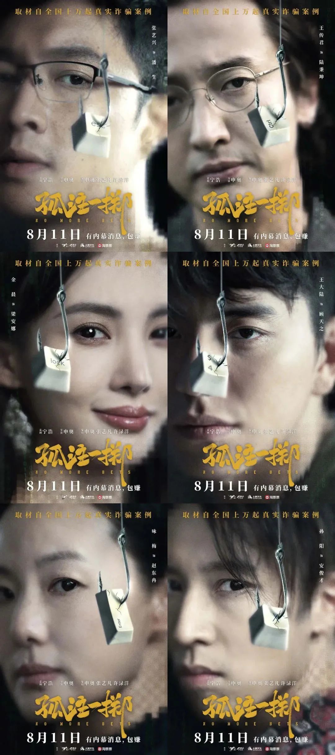 角色海报暗藏每个人物的命运和故事,人物面前分别放着不同鱼钩钓着的按键,代表不同意思。张艺兴的esc代表被解救或逃离;王传君的ctrl代表控制者;金晨的lock代表被困住;王大陆的4或“$”代表fall into money或是隐喻死亡的意思;咏梅的enter代表进入调查;孙阳的x代表未知和神秘。
