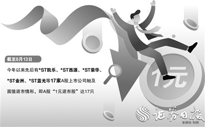 记者据Wind资讯数据和上市公司公告梳理发现,截至8月13日,今年以来先后有*ST凯乐、*ST西源、*ST荣华、*ST金洲、*ST蓝光等17家A股上市公司触及面值退市情形,即A股“1元退市股”达17只。而去年触及面值退市情形的公司仅1家。