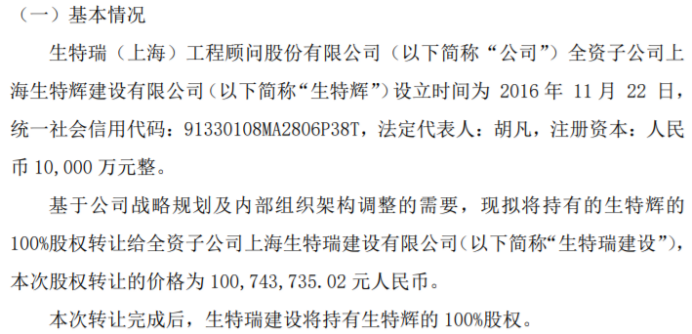 基于公司战略规划及内部组织架构调整的需要,现拟将持有的生特辉的100%股权转让给全资子公司上海生特瑞建设有限公司(以下简称“生特瑞建设”),本次股权转让的价格为100,743,735.02元人民币。本次转让完成后,生特瑞建设将持有生特辉的100%股权。