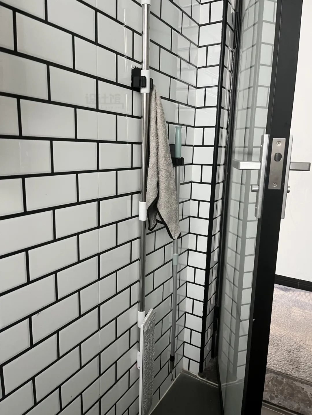 ③门背收纳:在卧室门背装挂钩,可以把临时换下的外套、居家服挂在这里;卫生间门背挂收纳架,可以把扫把拖把挂在这里。
