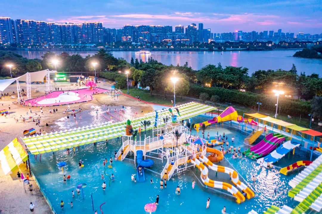同时,定位为城市精品综合亲水乐园的六松水上乐园,串联起水上乐园、儿童乐园、足球场、龙舟广场的功能区域,新增设飞帘、帐篷、蹦蹦床、粉红网红沙滩等设施设备,进一步增加体验感及趣味性。