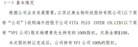 挖贝网8月15日,汉典生物(870405)近日发布公告,根据公司业务发展需要,江苏汉典生物科技股份有限公司(以下简称“公司”)收购海外控股子公司VITA PLUS INTER CO.LTD(以下简称“VPI公司)股东杨建青持有的100%股权,交易金额$100。本次股权转让完成后,公司持有VPI公司100%的股权。