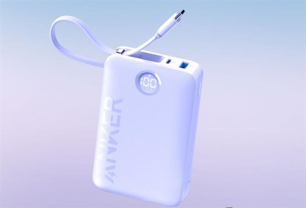 外观上,Anker 335移动电源壳体正反面采用消光磨砂工艺,提供丁香紫、幻影黑、极光白、奶油粉四种配色,自带的USB-C充电线平时可作为挂绳携带。