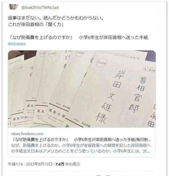 同日,《每日新闻》一篇报道引发日本社会强烈讨论。根据报道,今年年初,东京都世田谷区一所小学的36名六年级学生向首相岸田寄去多封书信,询问日本为何要增加国防开支,但没有得到答复。