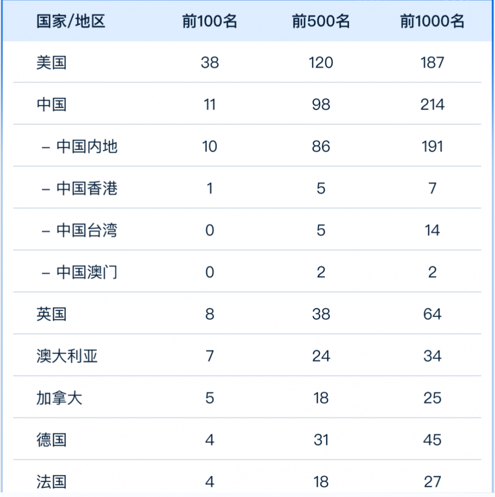 在全球1000强大学榜单中,今年中国内地共有191所高校上榜,较去年增加28所,历史首次超过美国上榜高校数(187所),位列世界第一。显示出中国研究型大学群体的学术实力和国际影响力在持续攀升。