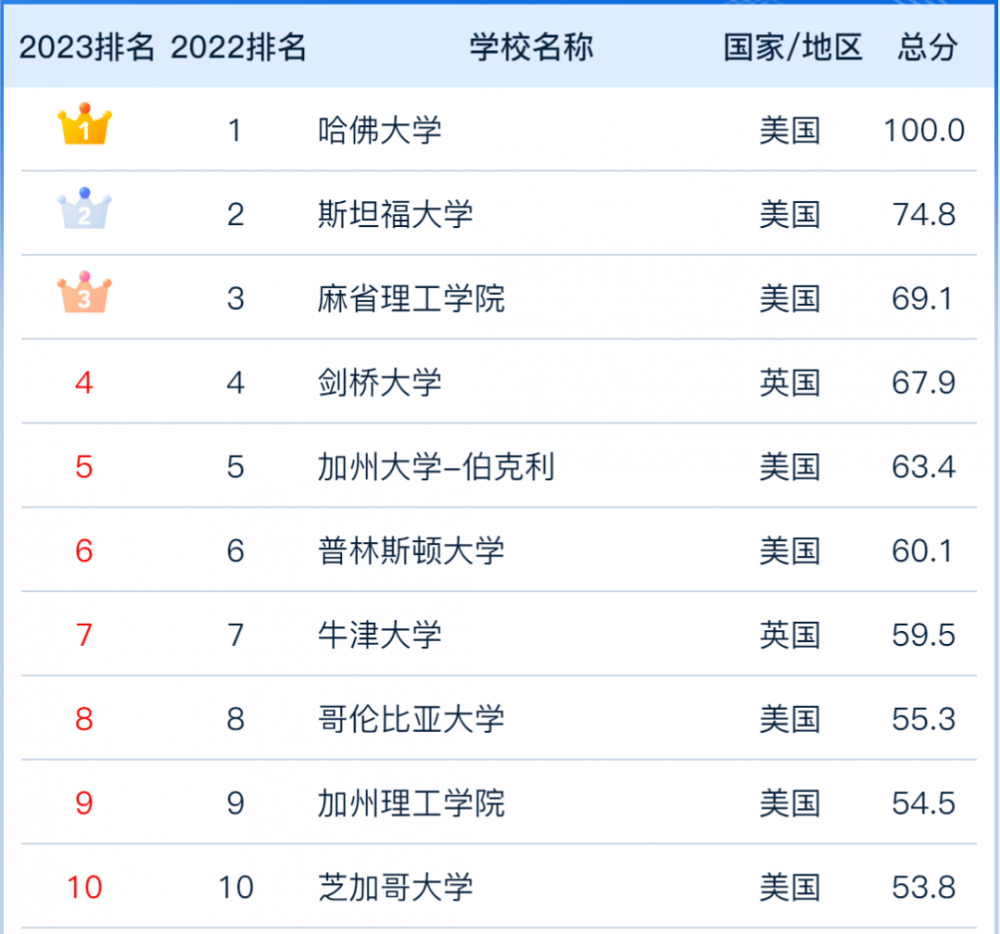 在今年的排名中,榜单前13名高校的顺序与去年保持完全一致,全部为美国、英国高校。