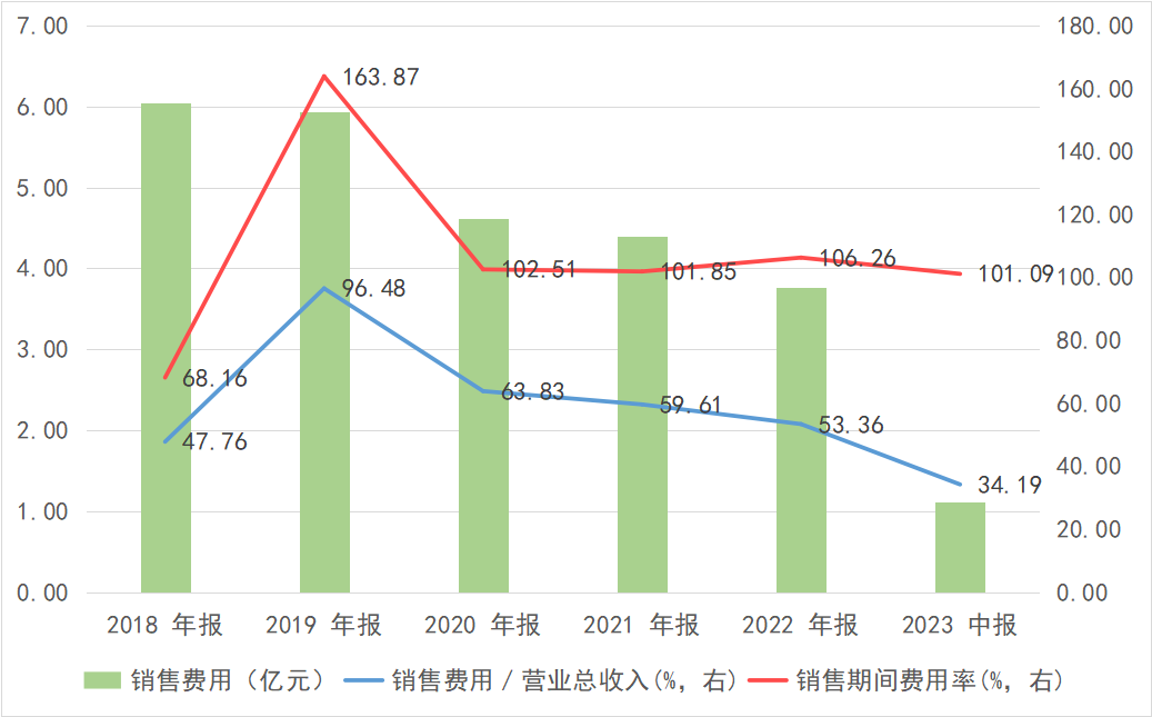 深入分析,这些期间费用主要是销售费用。2018-2022末以及2023年6月末,翰宇药业的销售费用分别为6.04亿、5.93亿、4.61亿、4.39亿、3.76亿以及1.11亿;占营业收入的比重分别为47.76%、96.48%、63.83%、59.61%、53.36%以及34.19%。