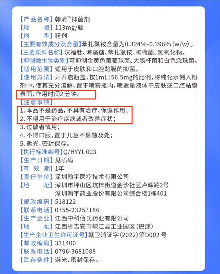 值得注意的是,虽然HY3000鼻喷雾剂已上市,不过其上市产品定位为“抑菌剂”而并非预期的“新冠鼻喷雾剂”。在产品包装盒上,也明确标注出该产品不是药品,不具有治疗、保健作用。同时,其作用时间仅为2分钟。