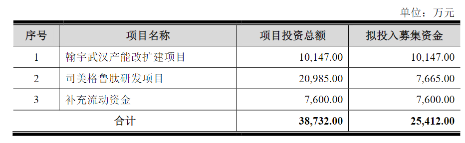 募集资金主要投向翰宇武汉产能改扩建项目、司美格鲁肽研发项目以及补充流动资金三个项目,拟投入的募集资金分别为1.01亿、0.77亿以及0.76亿元。